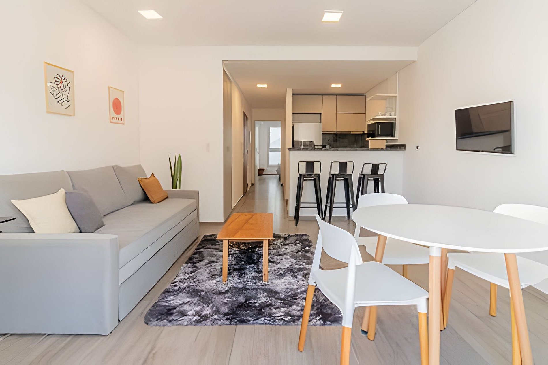 Cuenta con todo lo necesario para una excelente estadía: cocina completamente equipada y mesa circular, aire acondicionado en ambos ambientes, cama Queen Size. Cortinas Black Out, Wifi y un Smart TV. Opción de convertir el sofá en dos camas individuales, ideal para niños o adolescentes debido a sus dimensiones.