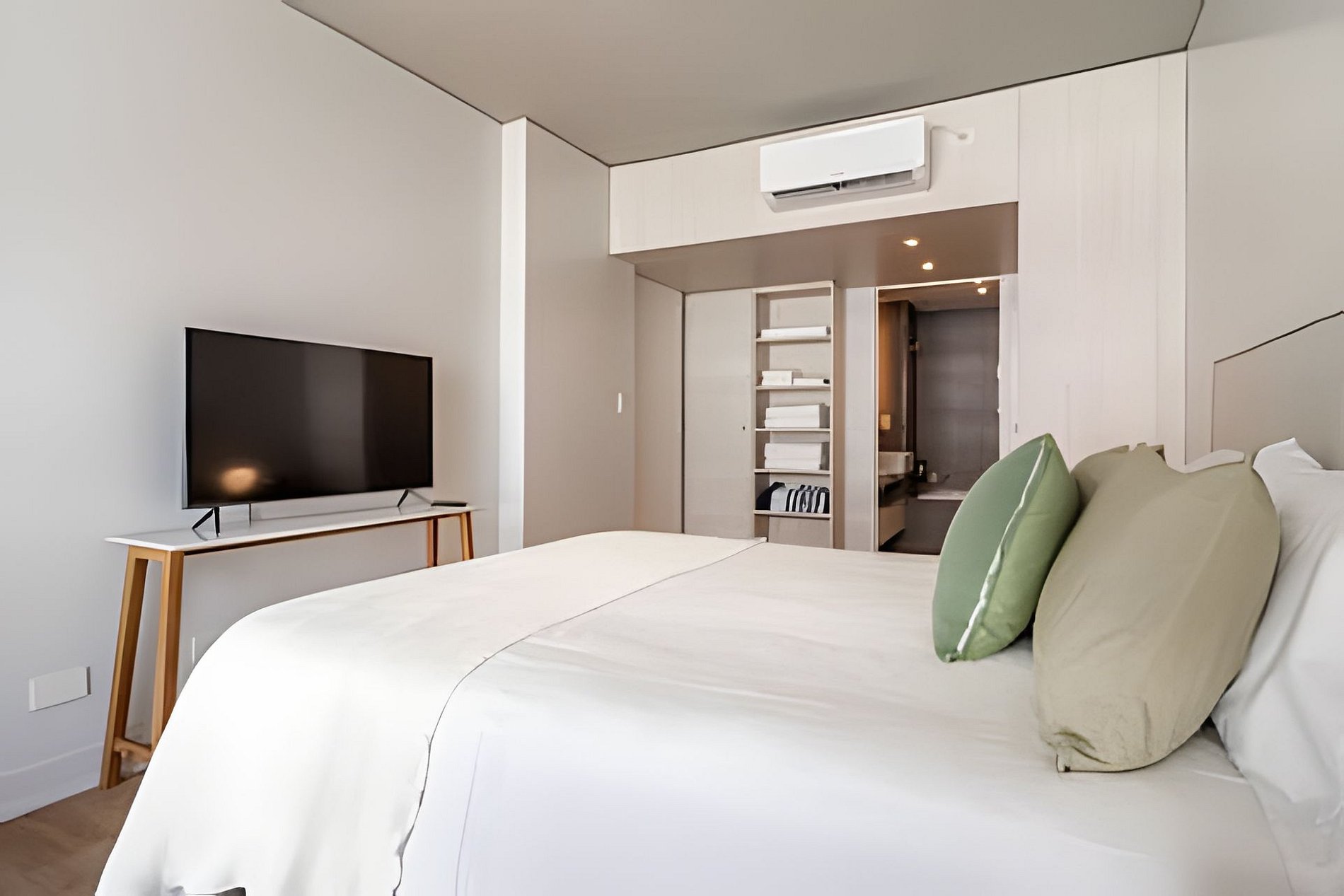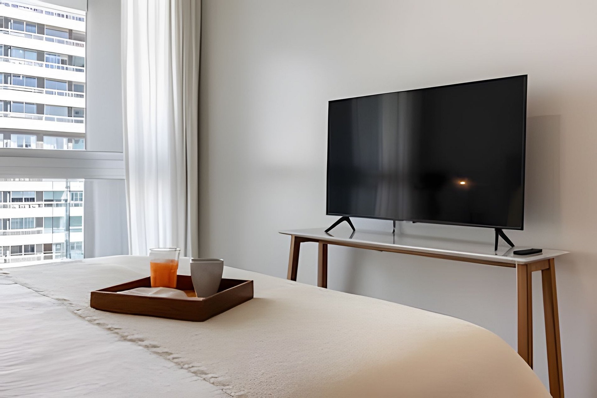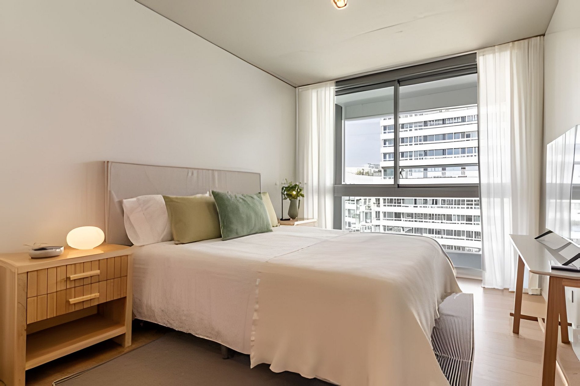 Cuenta con todo lo necesario para una excelente estadía: living comedor con cocina completamente equipada, vajilla completa, cafetera Nespresso, aire acondicionado en ambos ambientes, balcón soleado con vistas a la piscina, WiFi,y Smart TVs,. El apartamento tiene 2 baños: toilette + un baño completo. La habitación es muy amplia. Está provista de una cama queen-size (160 cm) con ropa de cama blanca de algodón de primera calidad y dispone de cortinas roller black out con automatización a control remoto, con cierre a la perfección para asegurar un descanso en total oscuridad.