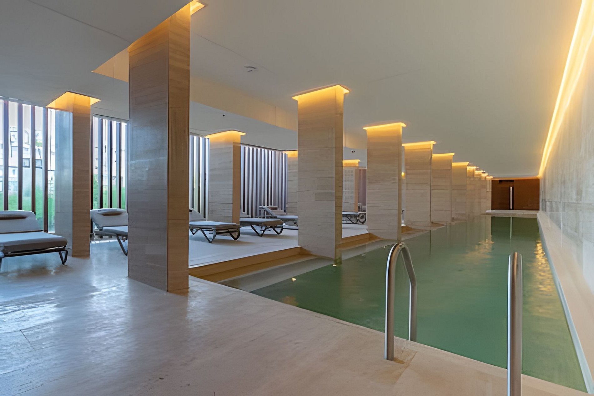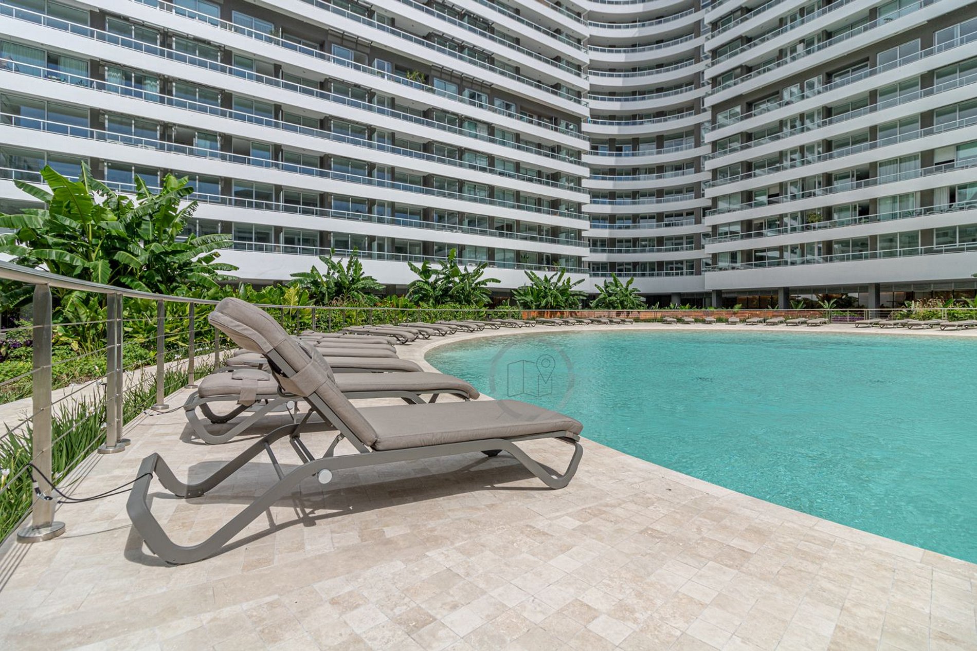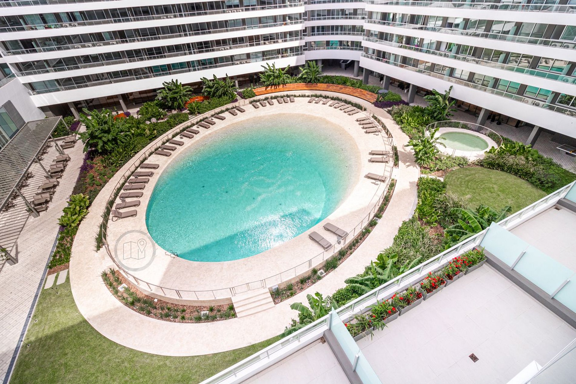 El edificio ofrece una piscina circular externa, otra piscina interior de 25 metros de largo para nadar y un hidromasaje escandinavo en el sector de spa. Además, cuenta con sauna, servicio de masajes, jacuzzi y salas de relajación. El complejo dispone de un gimnasio con equipamiento de primera línea, sala de pilates, sala de yoga, y un circuito aeróbico parquizado de 360º. Salon de belleza dentro del complejo, exclusivo para huespedes. Se requiere reserva.