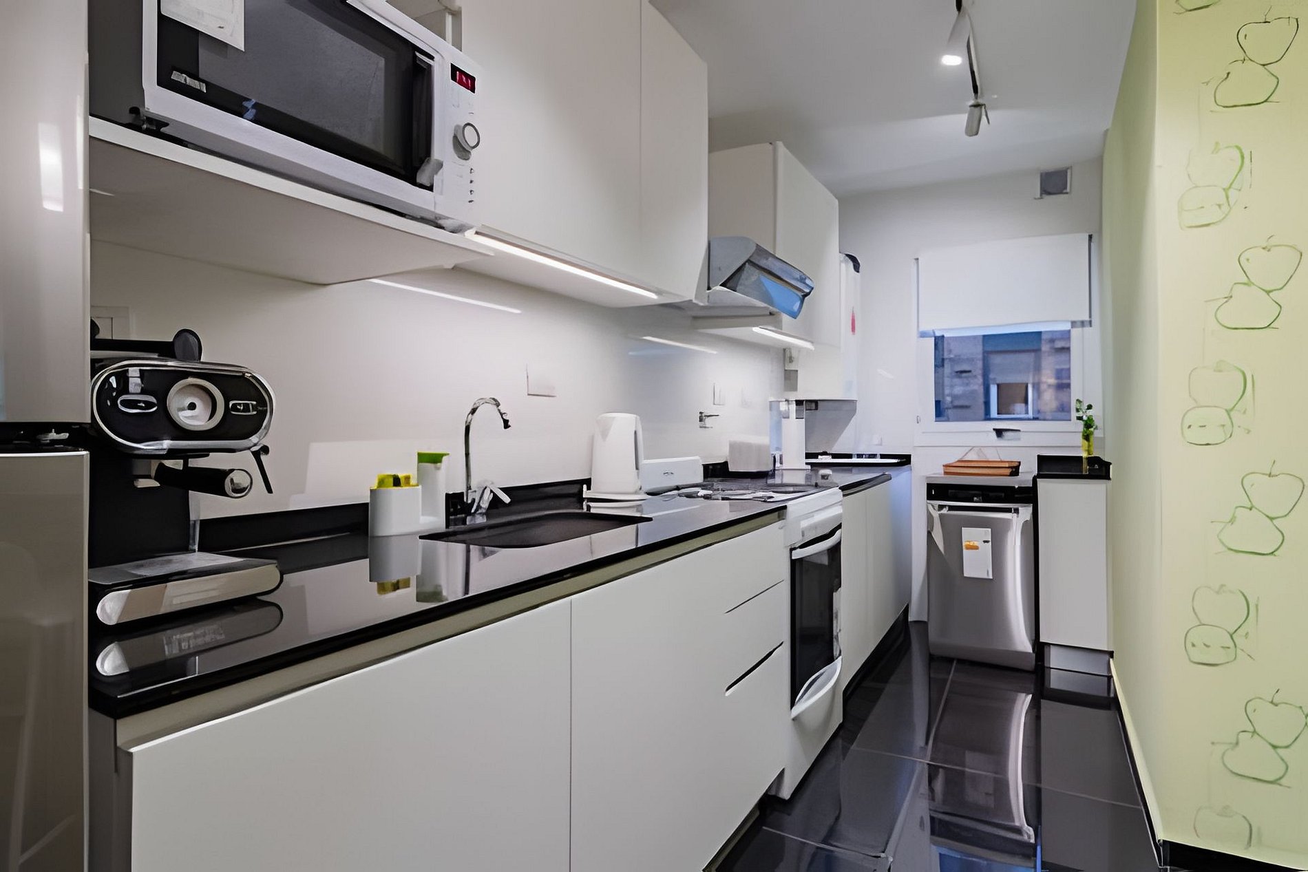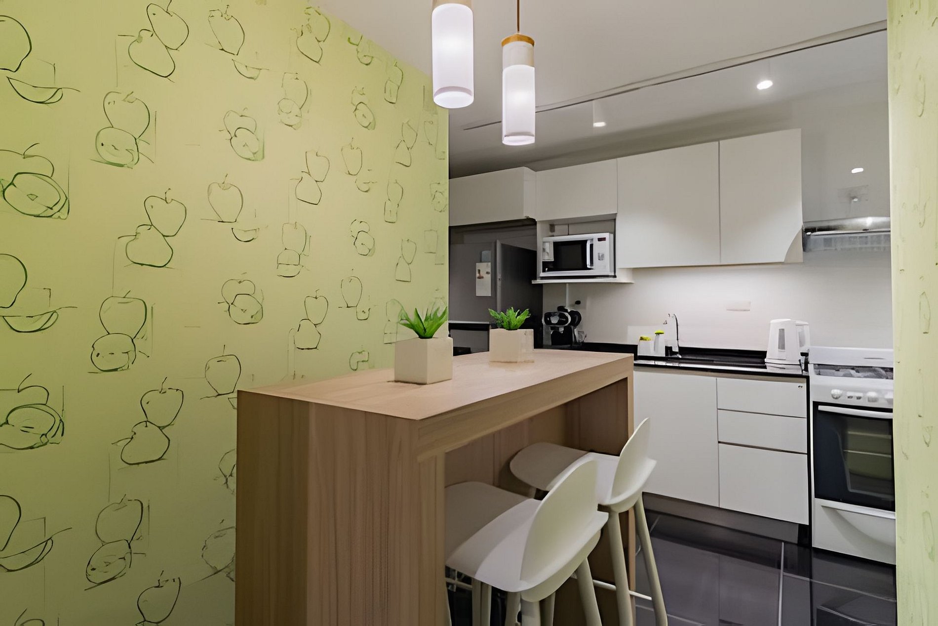 Cuenta con todo lo necesario para una excelente estadía: dos cómodas habitaciones, dos baños completos, sala de estar con sofá, mesa y TV, cocina totalmente equipada, aire acondicionado en ambas habitaciones y sala de estar, y un amplio balcon con vistas a la cuidad. El area de la cocina tiene una mesa alta ideal para desayunar, una cafetera espresso, lavavajillas, horno y microondas.