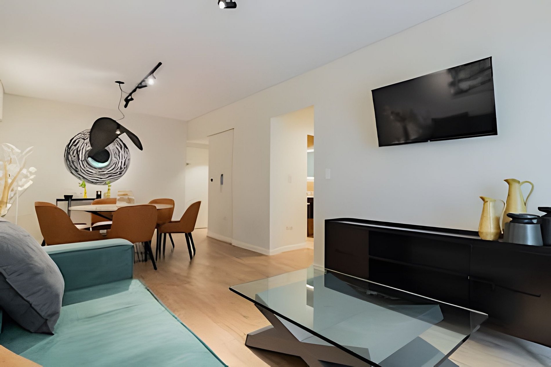 Cuenta con todo lo necesario para una excelente estadía: dos cómodas habitaciones, dos baños completos, sala de estar con sofá, mesa y TV, cocina totalmente equipada, aire acondicionado en ambas habitaciones y sala de estar, y un amplio balcon con vistas a la cuidad. El area de la cocina tiene una mesa alta ideal para desayunar, una cafetera espresso, lavavajillas, horno y microondas.