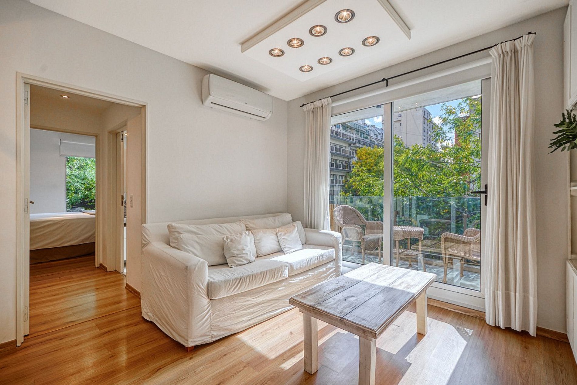 Cuenta con todo lo necesario para una excelente estadía: cocina completamente equipada, aire acondicionado en ambos ambientes, cama king size, cortinas black-out en el dormitorio para tener oscuridad total, y un amplio balcón soleado. El living comedor tiene un sofá (convertible en cama para una persona adicional), pero NO cuenta con cortina black out en este espacio. El apartamento ofrece Laundry en el subsuelo del edificio. Funciona con fichas que pueden comprarse a una cuadra del departamento.